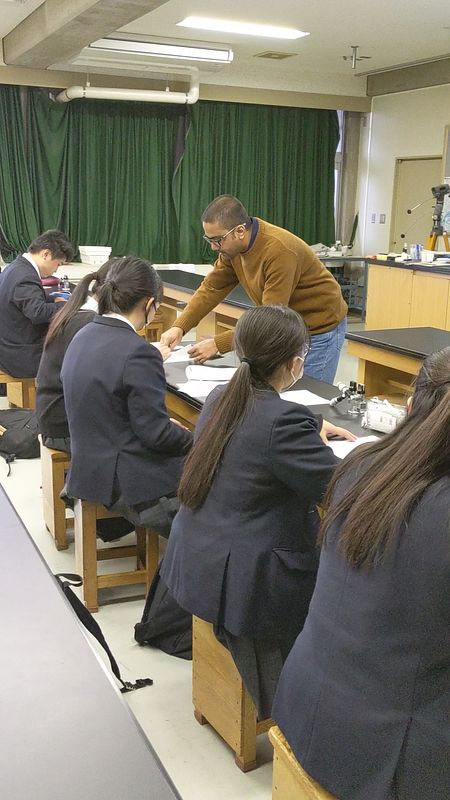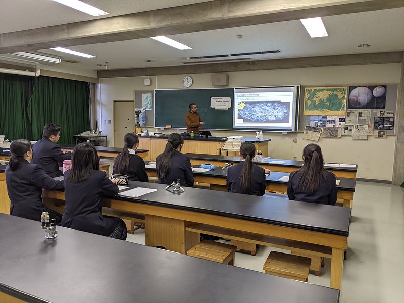 Kagawa Chuo High School (Takamatsu, Japan). The participants of the lecture session included eight students from the 10th grade and three teachers. The lecture focused on geology basics, the contributions of structural geologists to the society, my own research and its significance, and demonstrations of using the stereonet to plot structural data. Interacting with the students was a delightful and enriching experience and I am happy that the students loved it. Here's their