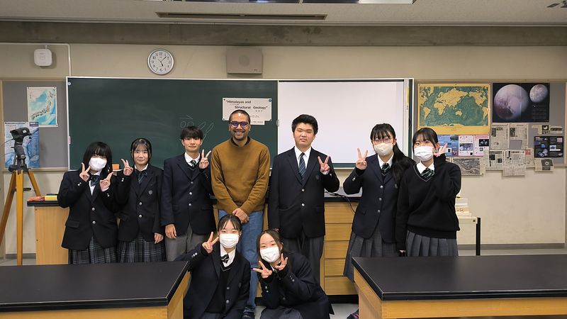 Kagawa Chuo High School (Takamatsu, Japan). The participants of the lecture session included eight students from the 10th grade and three teachers. The lecture focused on geology basics, the contributions of structural geologists to the society, my own research and its significance, and demonstrations of using the stereonet to plot structural data. Interacting with the students was a delightful and enriching experience and I am happy that the students loved it. Here's their
