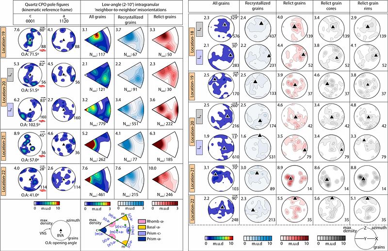 Selected results of CPO, low angle (2–10°) misorientation (left panel), and CVA (right panel) analyses of the quartz grains from the granite gneiss of the Tso Morari Crystallines..