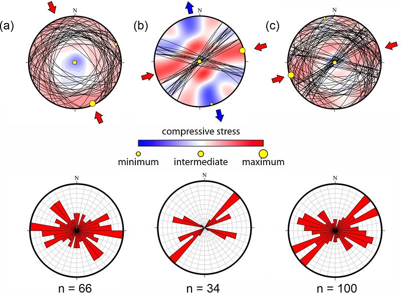 Results of the paleostress analysis and rose diagrams of the trends of the corresponding joints. In (a) & (b), the two joint sets are examined separately, whereas in (c) both sets are analysed together.